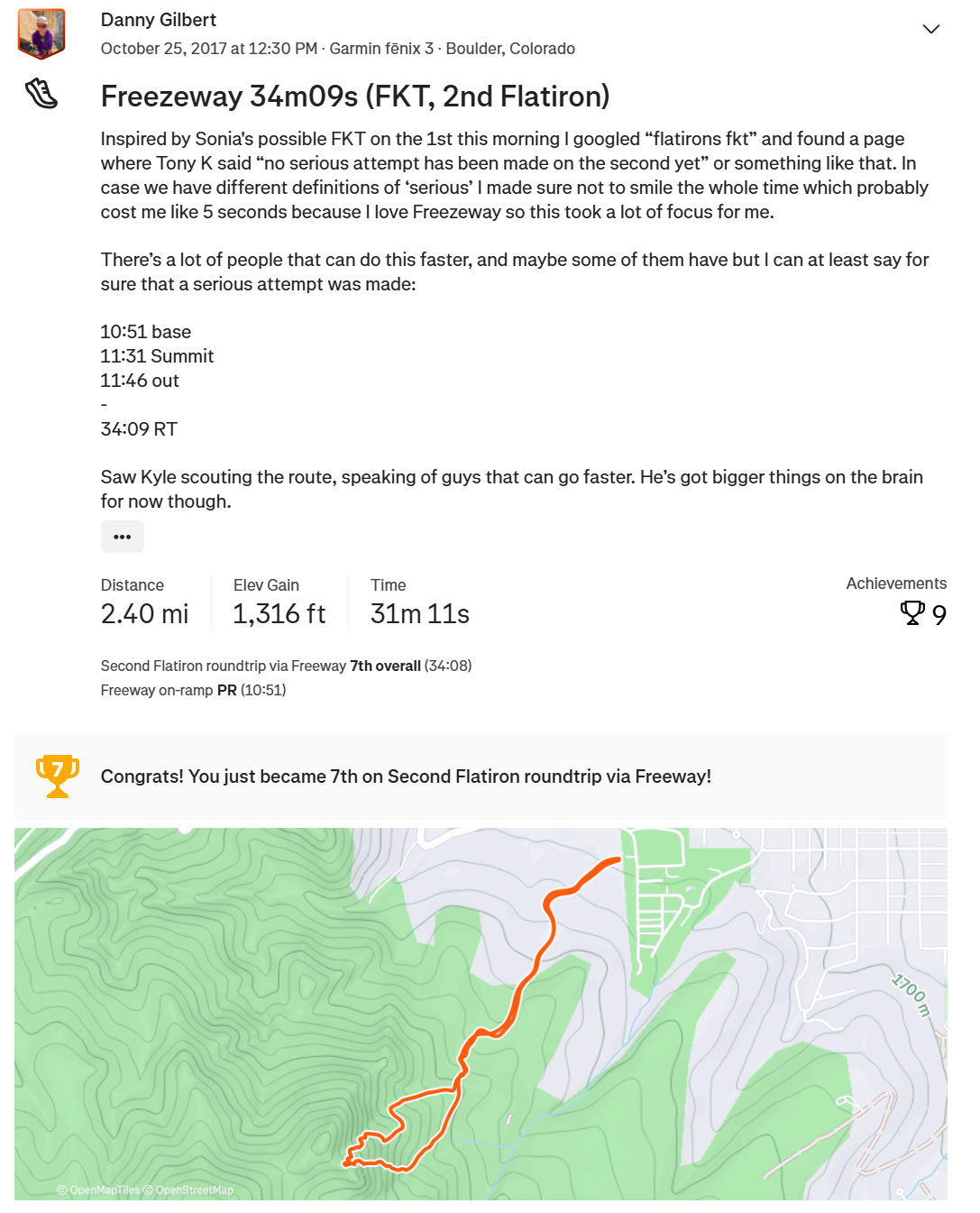 This has since been done faster, but for a brief moment in time I was the fastest guy to have done one of the numbered Flatirons and I still think that’s pretty neat.